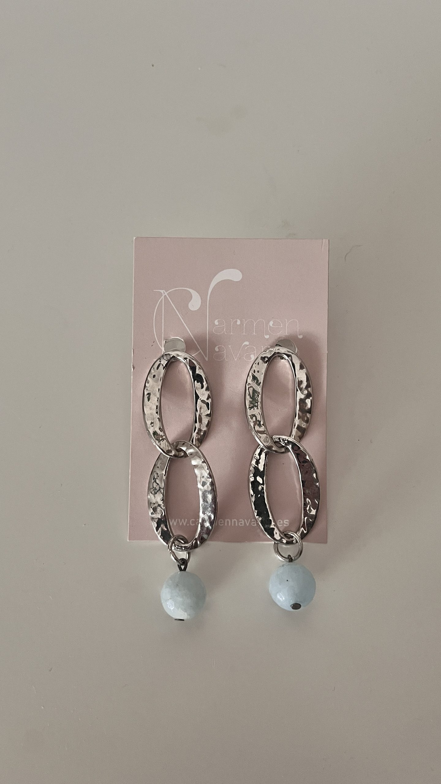Pendientes plateados doble eslabón piedra azul bebe 7cm longitud. Cierre presión.